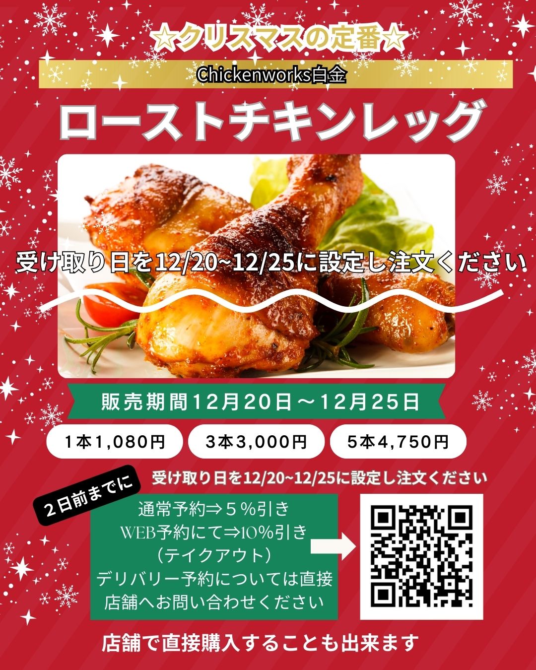 今年もチキンワークス白金ではクリスマスの定番「ローストチキンレッグ」の販売を致します!